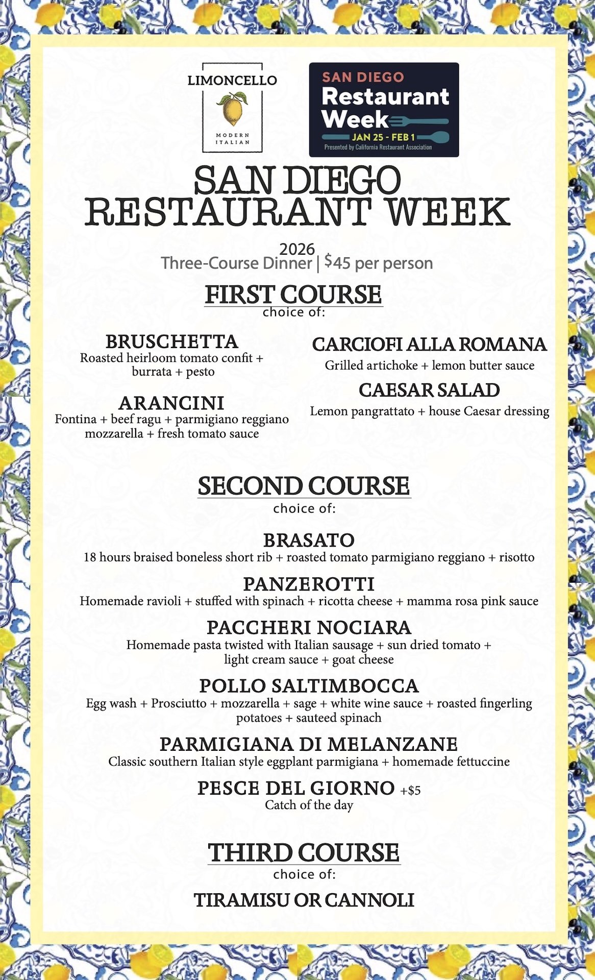 San Diego Restaurant Week Menu